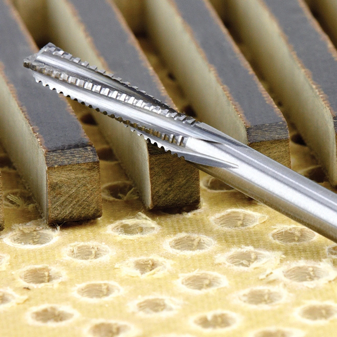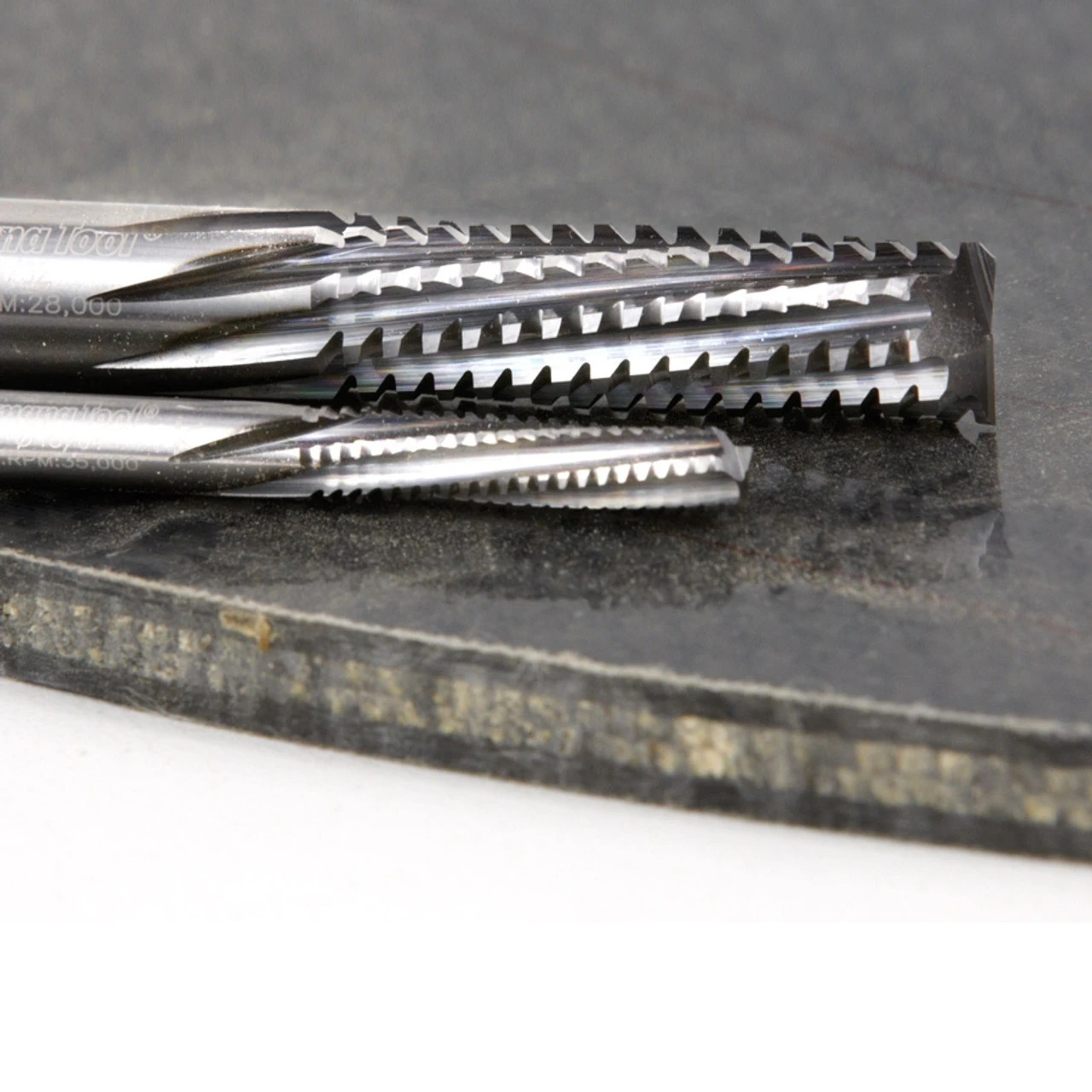 Special grade solid carbide bits feature unique grinding and multi spiral flute design. Suitable for ‘roughing’ cuts in hard and abrasive composite materials such as: carbon fiber, Trespa®, fiberglass, fiberglass PCB board, etc. Special grade carbide for maximum durability. Down-Cut for better clamping when machining small work pieces and improved finish on the top of the board.
