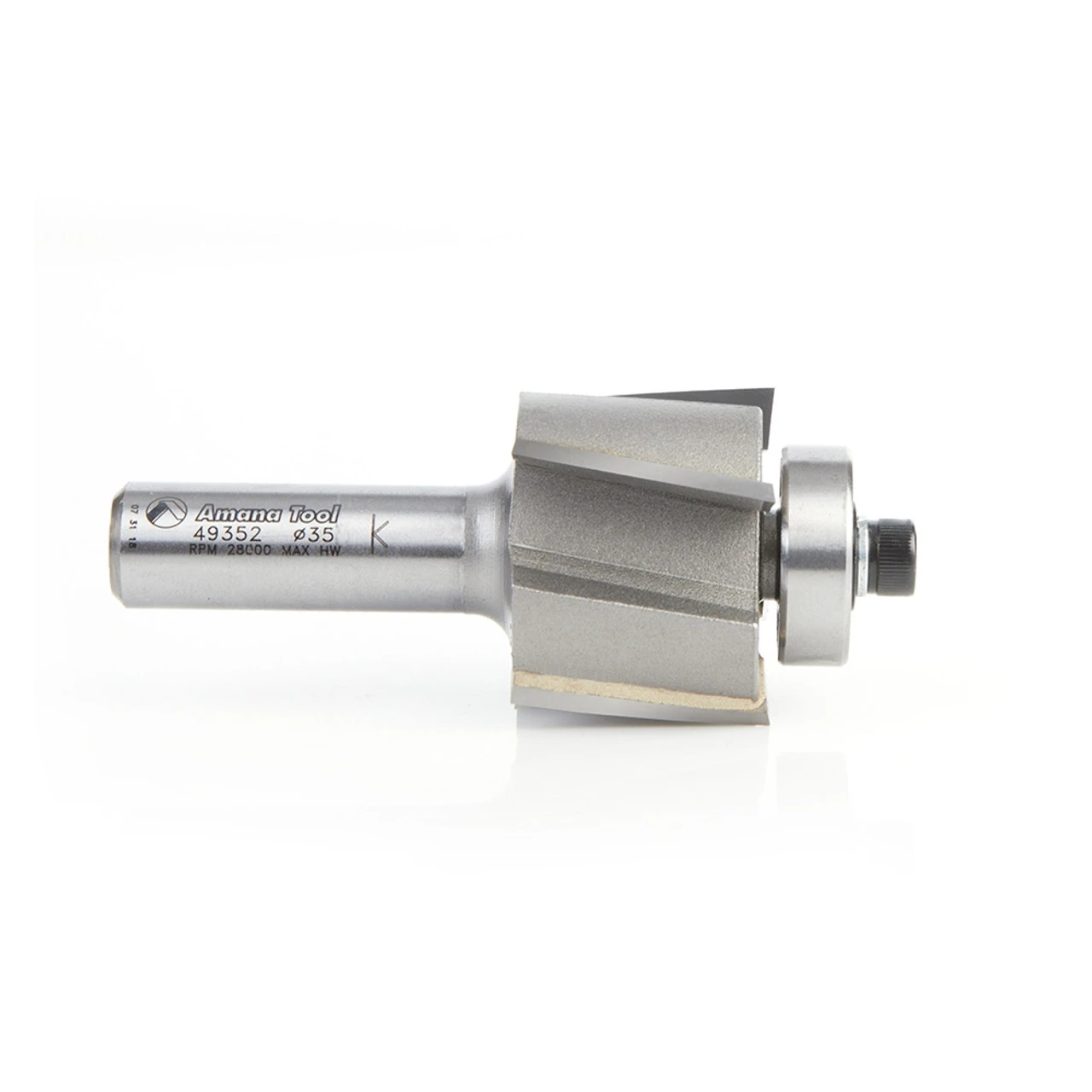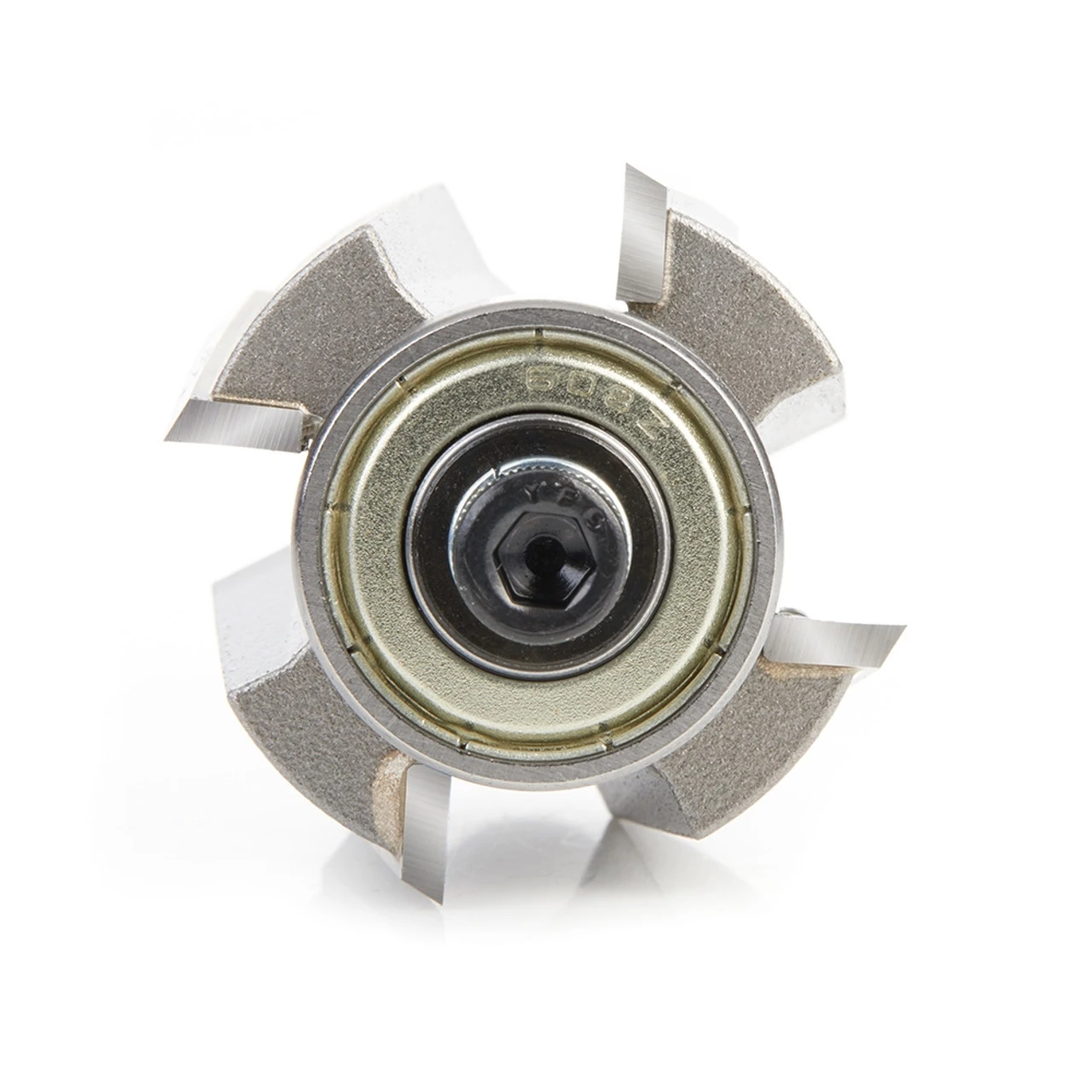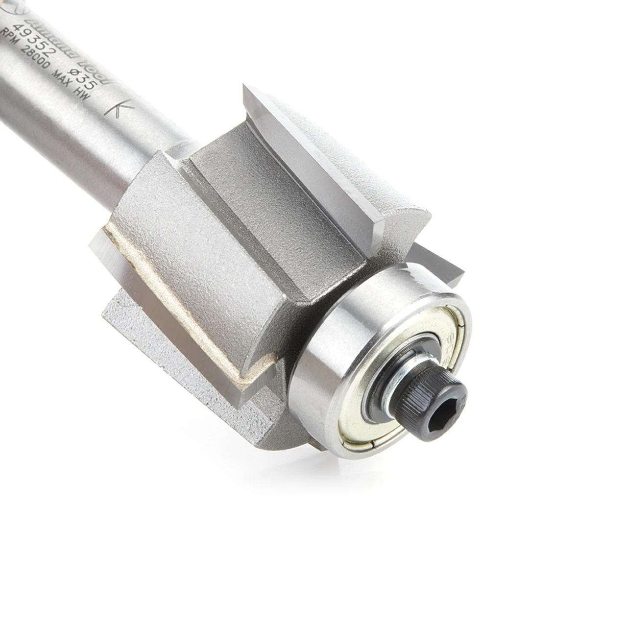 The Multi-Rabbet bit steps in 1/16″ increments from a 1/4″ cut width to 1/2″, simply by switching ball-bearing guides. Five different bearings are provided. Depth of cut capacity of 1/2″.