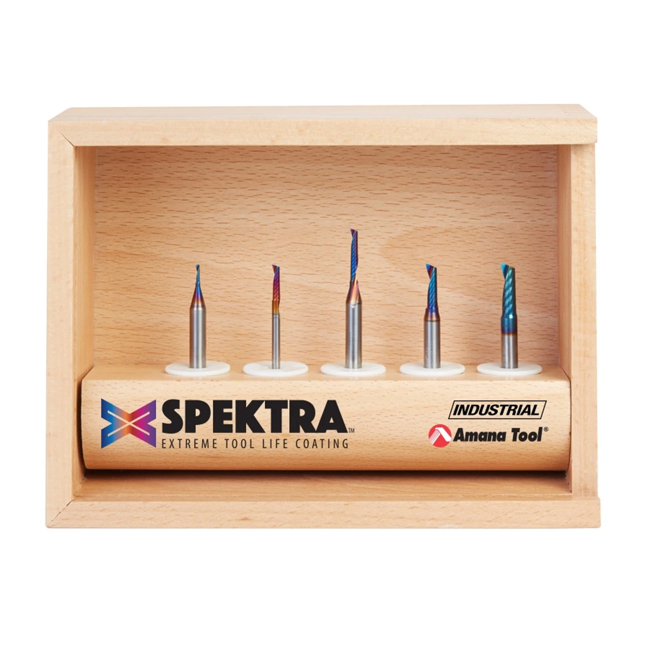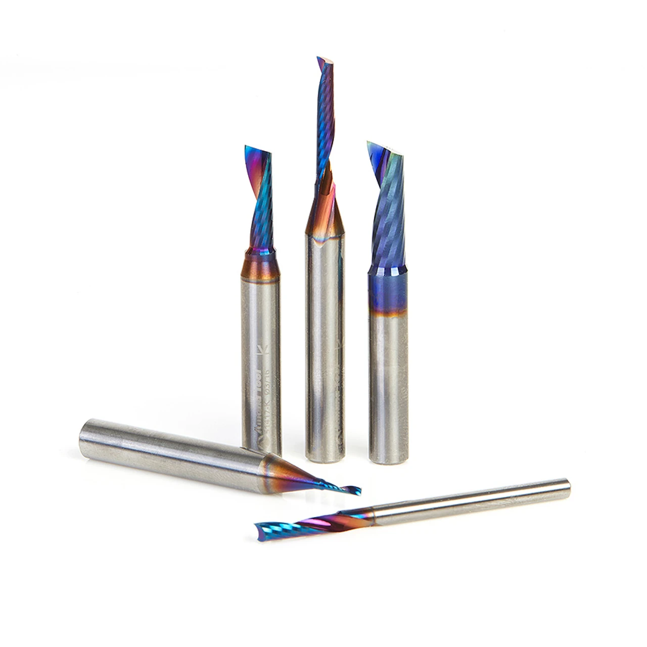 Solid Carbide Spektra™ Extreme Tool Life Coated Plastic Cutting Spiral ‘O’ Flute CNC Router Bits with special unique carbide with nACo® nanocomposite coating for longer lifetime in plastics and other materials.