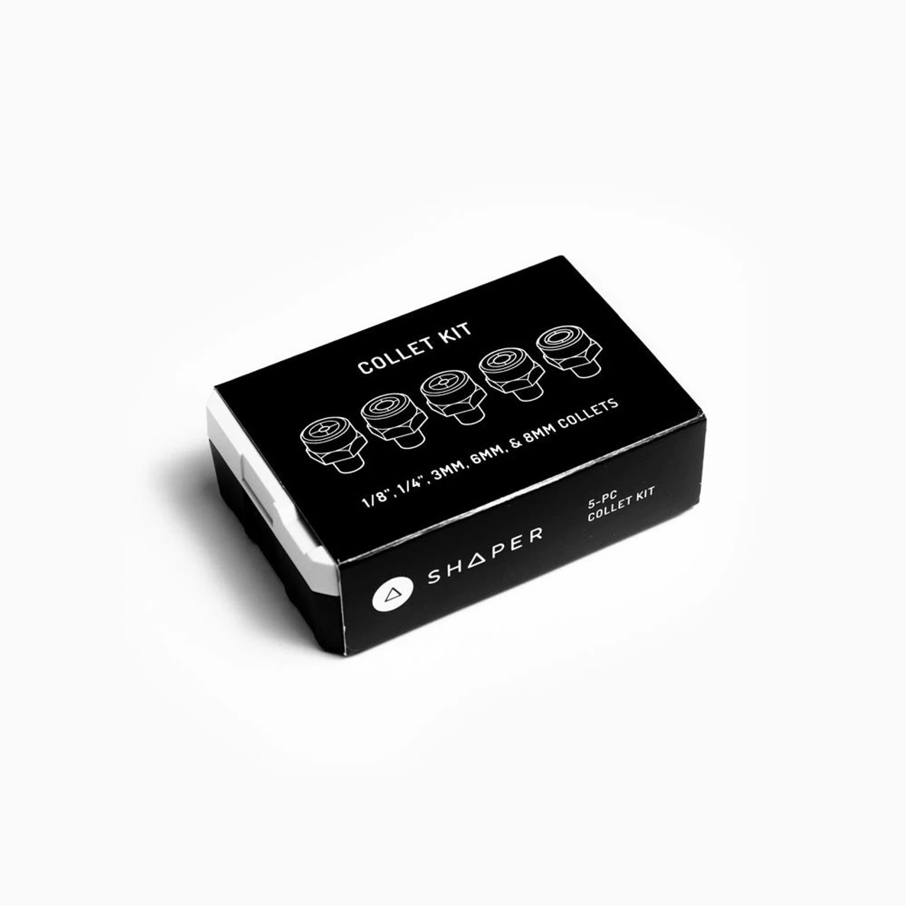 The complete collet kit includes: (1) 3 mm collet; (1) 6 mm collet; (1) 8 mm collet; 1/8″ collet; 1/4″ collet
