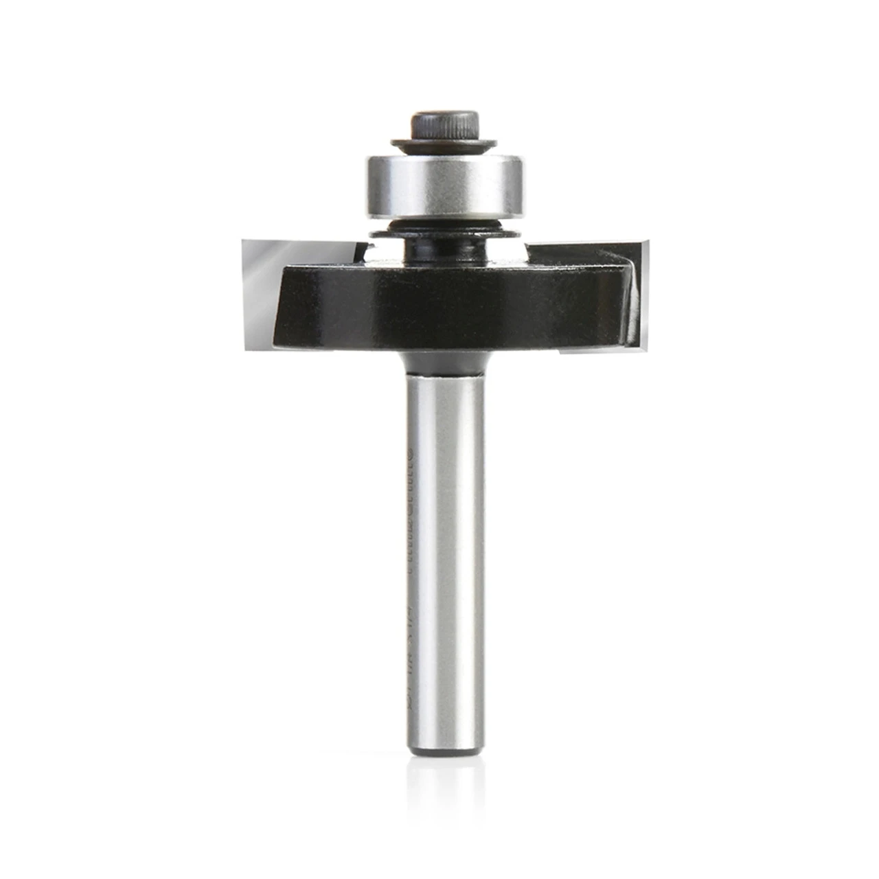 This is the basic rabetting bit. It cuts 3/8″ wide and up to 1/2″ deep. Switch to one of four optional ball-bearing guides to alter the width of cut. Use in all handheld and table-mounted routers.